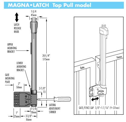 The ideal gate latch for most swimming pool gates and child safety areas such as daycare centers. Key lockable. Highly child resistant, magnetic latching (no mechanical resistance to closure). Fits most gate/fence heights but is ideal for common gates/fences 48″ (1200mm) high or higher because the latch can be installed so that the release knob is out of reach of small children. Consult local authorities for height measurement/requirements on swimming pool gates.