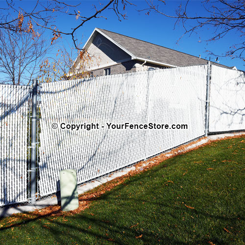 We get asked all the time how do you install chain link fence for uneven ground. Most fence contractors and installers call this a bias cut. This is fairly easy and straight forward. Make sure your posts are installed straight up and down (vertical). This picture below shows a fence installed on a slope. This fence has privacy slats and is six feet high. The sections of fence on both sides of the bias are on even ground. Let’s learn how to install the middle section (bias) that is on the slope. The chain link fence on the slope is its own section of chain link fence – not connected to the sections on the sides. On both ends of the bias you will notice that this section has its own tension bars and brace bands. If you are not familiar with this terminology you can visit this section of our website that has detailed information on how to install chain link fence. We have found it is easier to install the flat (horizontal) areas first and then install the sections that have a slope last.