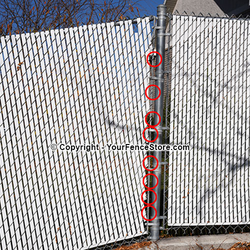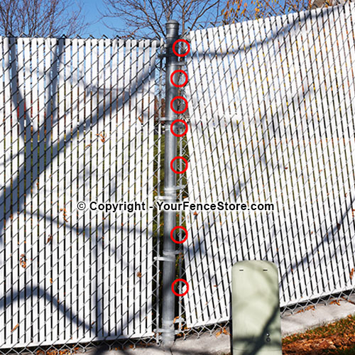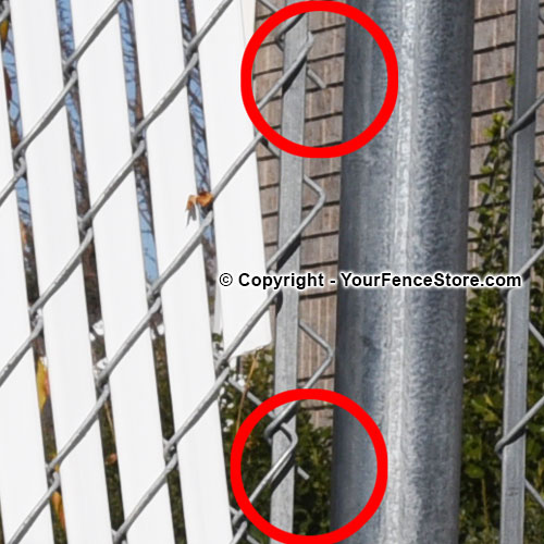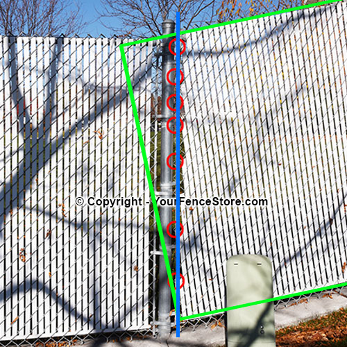 The red circles indicate where the chain link has been cut to accommodate the bias (bias cut). The terminal post on the downhill side of the slope usually needs to be taller.