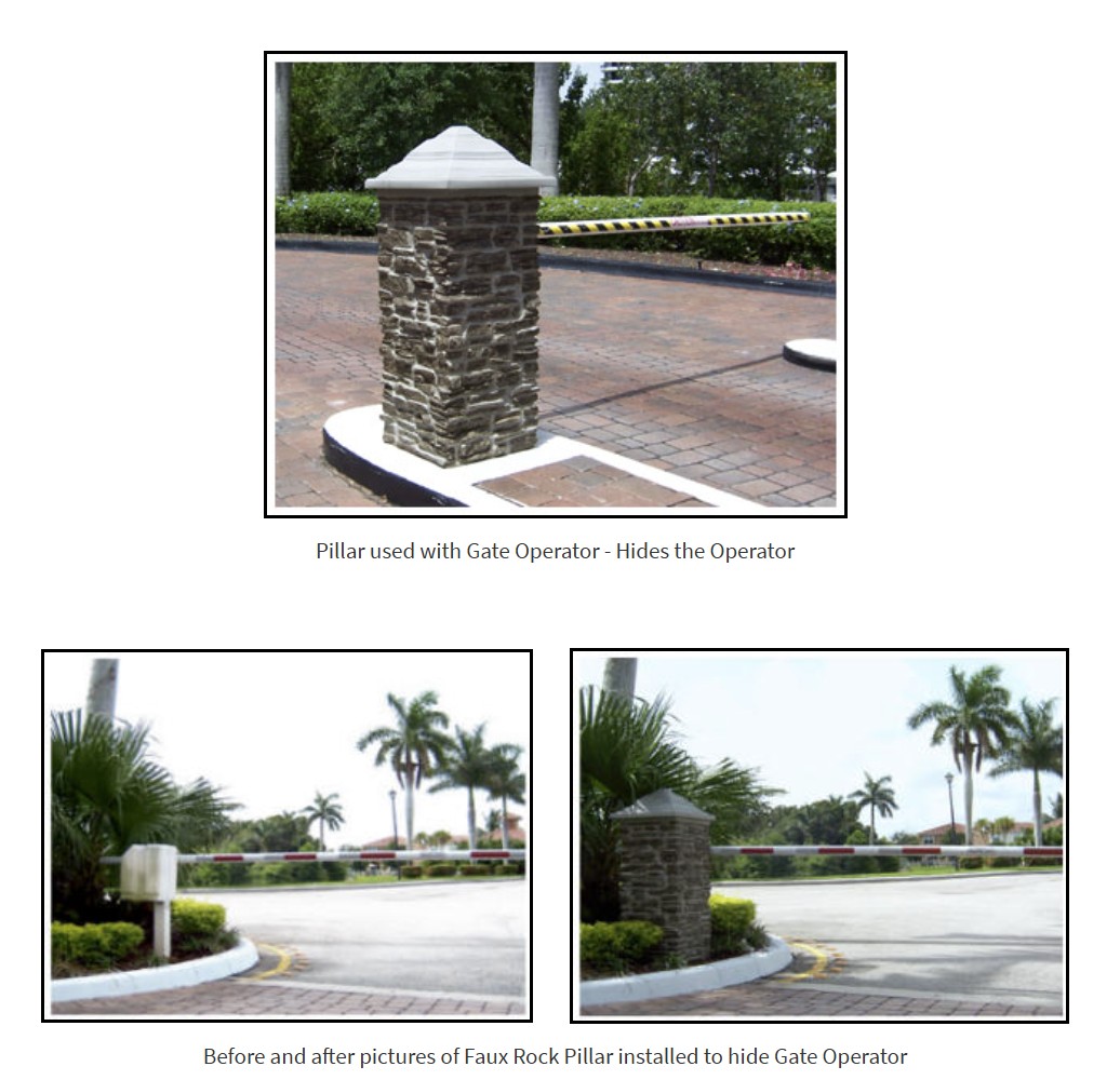 Rock Pillar Installation Instructions: Pre-formed faux pillars are designed to enhance existing fences and new installations. Pillars can be buried for shorter applications. When setting elevation, it is important to establish the height by the finished concrete elevation in the initial hole. The Rock Post is slid over the pre-installed 4×4 or 5×5 post and secured into place by putting additional concrete or gravel inside the Rock Post. For corner posts, gate post, mailbox, or signs, the entire Rock Post may be filled with concrete. Cutting the Rock Post for vinyl, split rail, log, etc. is simple!! By using a hole saw, router, or jigsaw, holes can be cut through the 1/4″ wall to receive any configuration. The simulated concrete cap is removable and is designed to accept different lighting applications.